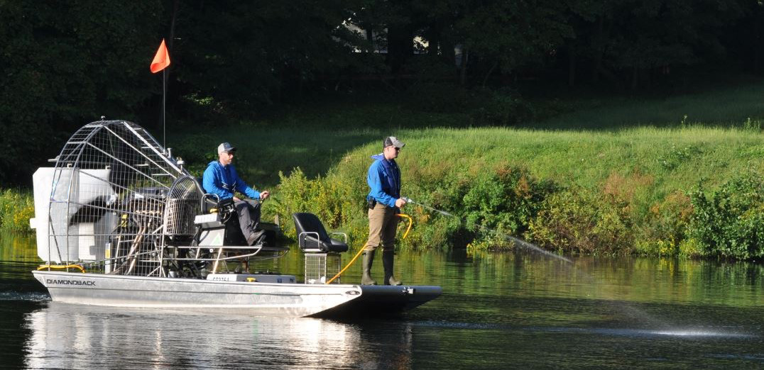 After a decade of chemical treatments costing up to $250,000 per year, the Commission stopped using herbicides. Within a few years, the milfoil population began rebounding. Manual removal is expensive — around $2,500 per day — and never fully effective.