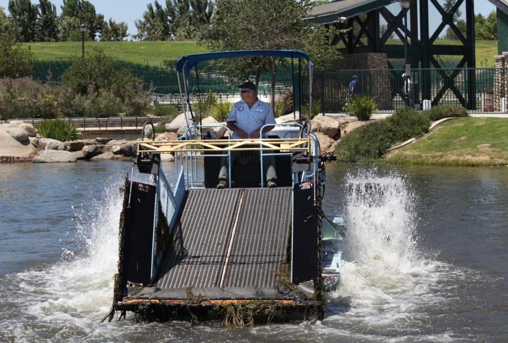 At Bakersfield’s River Walk, an aquatic weed harvester works like an underwater lawn mower, cutting and collecting weeds before they reach the surface. The harvested plants are transported to shore, where they are removed and disposed of responsibly.
